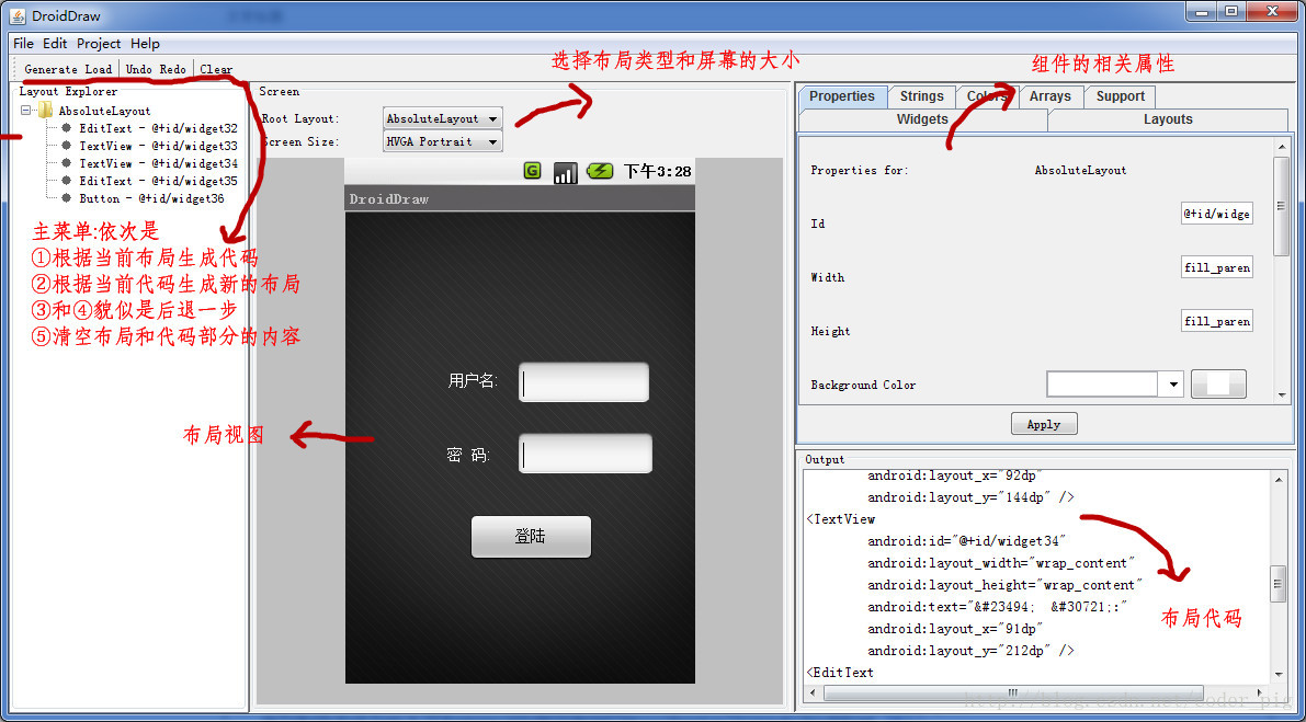 当然,或许以上两种方法都不喜欢,你想拖拉后就直接生成正确的代码~! ok,没问题,推荐你使用前面界面原型那里给大家介绍的一个工具:DroidDraw