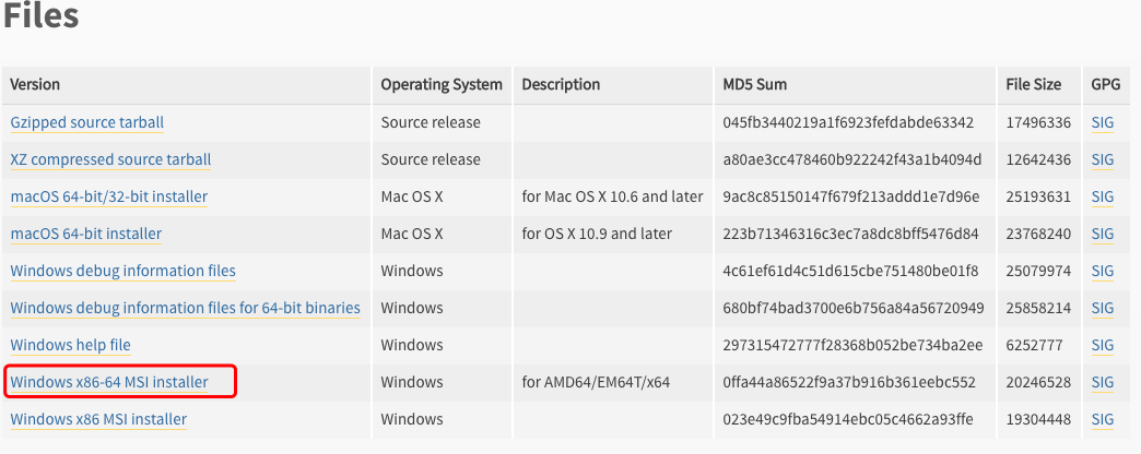 在下载列表中选择Window平台安装包,包格式为:python-XYZ.msi 文件 , XYZ 为你要安装的版本号。