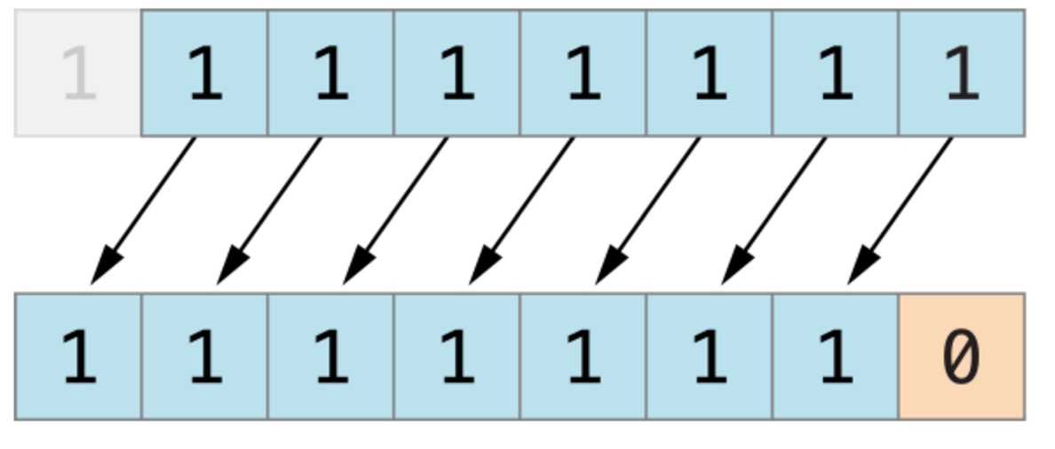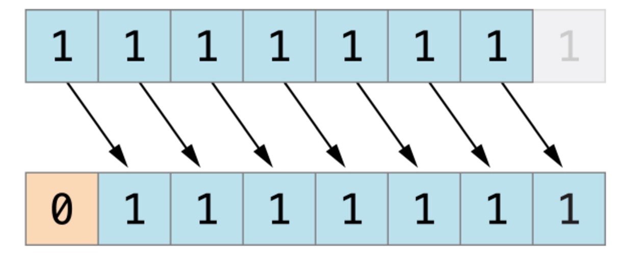 | << | 按位左移。左移操作符(<<)将操作数的所有位向左移动指定的位数。 | 下图展示了11111111 << 1(11111111 左移一位)的结果。蓝色数字表示被移动位,灰色表示被丢弃位,空位用橙色的0填充。 ![]() | A << 2 结果为 240, 二进制为 1111 0000 |