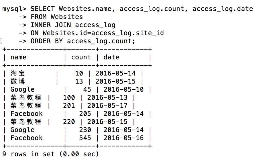 mysql> SELECT * FROM access_log;+-----+---------+-------+------------+| aid | site_id | count | date |+-----+---------+-------+------------+| 1 | 1 | 45 | 2016-05-10 || 2 | 3 | 100 | 2016-05-13 || 3 | 1 | 230 | 2016-05-14 || 4 | 2 | 10 | 2016-05-14 || 5 | 5 | 205 | 2016-05-14 || 6 | 4 | 13 | 2016-05-15 || 7 | 3 | 220 | 2016-05-15 || 8 | 5 | 545 | 2016-05-16 || 9 | 3 | 201 | 2016-05-17 |+-----+---------+-------+------------+9 rows in set (0.00 sec)
