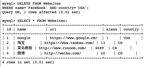 假设我们要从 "Websites" 表中删除网站名为 "Facebook" 且国家为 USA 的网站。