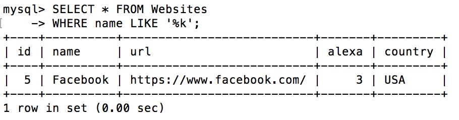 WHERE name LIKE '%k';