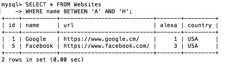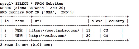 mysql> SELECT * FROM Websites;+----+---------------+---------------------------+-------+---------+| id | name | url | alexa | country |+----+---------------+---------------------------+-------+---------+| 1 | Google | https://www.google.cm/ | 1 | USA || 2 | 淘宝 | https://www.taobao.com/ | 13 | CN || 3 | 菜鸟教程 | http://www.runoob.com/ | 5000 | USA || 4 | 微博 | http://weibo.com/ | 20 | CN || 5 | Facebook | https://www.facebook.com/ | 3 | USA || 7 | stackoverflow | http://stackoverflow.com/ | 0 | IND |+----+---------------+---------------------------+-------+---------+