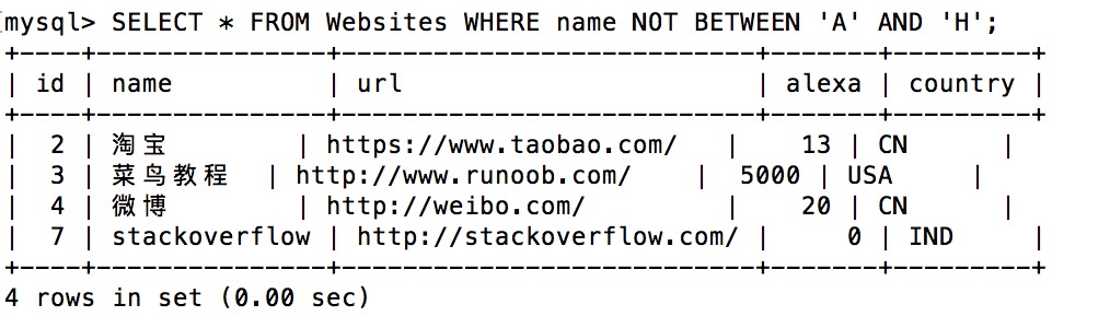 如需显示不在上面实例范围内的网站,请使用 NOT BETWEEN: