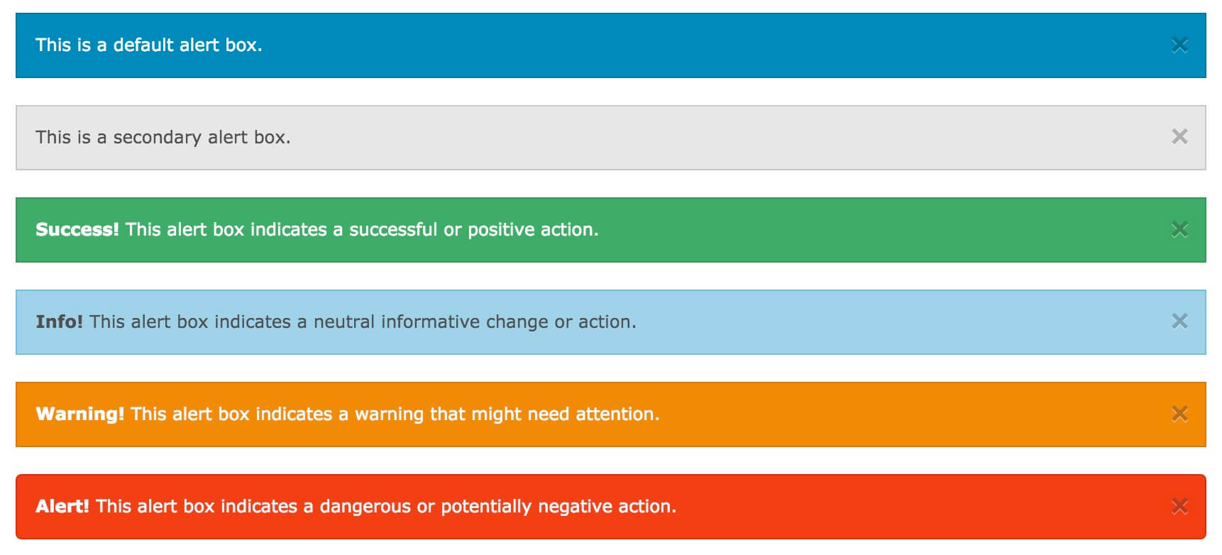 提醒框可以使用 .alert-box 类创建, 可以添加可选的类: .secondary, .success, .info, .warning 或 .alert:
