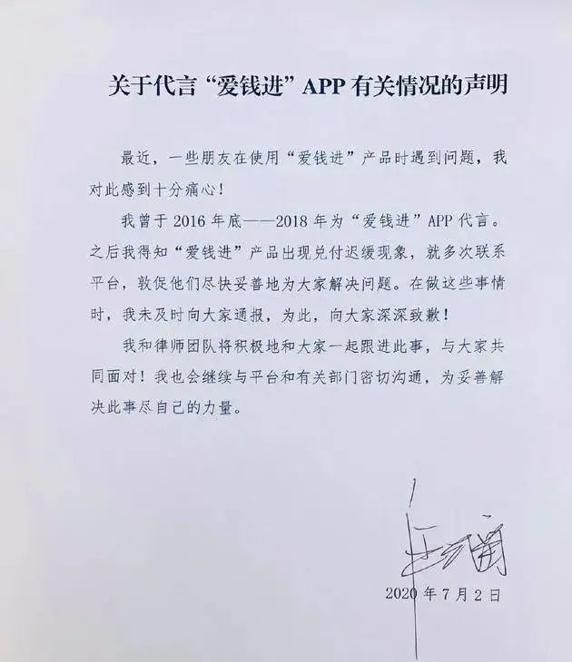 汪涵、刘国梁等名人都为爱钱进APP广告代言,因此这两人也被推到了舆论的风口浪尖。在汪涵前几天发布了道歉信之后,刘国梁也在昨天接受采访时向广大网友和平台用户表达歉意。