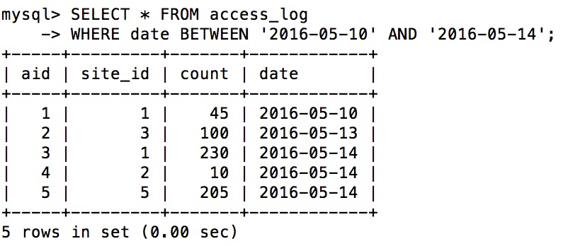 mysql> SELECT * FROM access_log;+-----+---------+-------+------------+| aid | site_id | count | date |+-----+---------+-------+------------+| 1 | 1 | 45 | 2016-05-10 || 2 | 3 | 100 | 2016-05-13 || 3 | 1 | 230 | 2016-05-14 || 4 | 2 | 10 | 2016-05-14 || 5 | 5 | 205 | 2016-05-14 || 6 | 4 | 13 | 2016-05-15 || 7 | 3 | 220 | 2016-05-15 || 8 | 5 | 545 | 2016-05-16 || 9 | 3 | 201 | 2016-05-17 |+-----+---------+-------+------------+9 rows in set (0.00 sec)